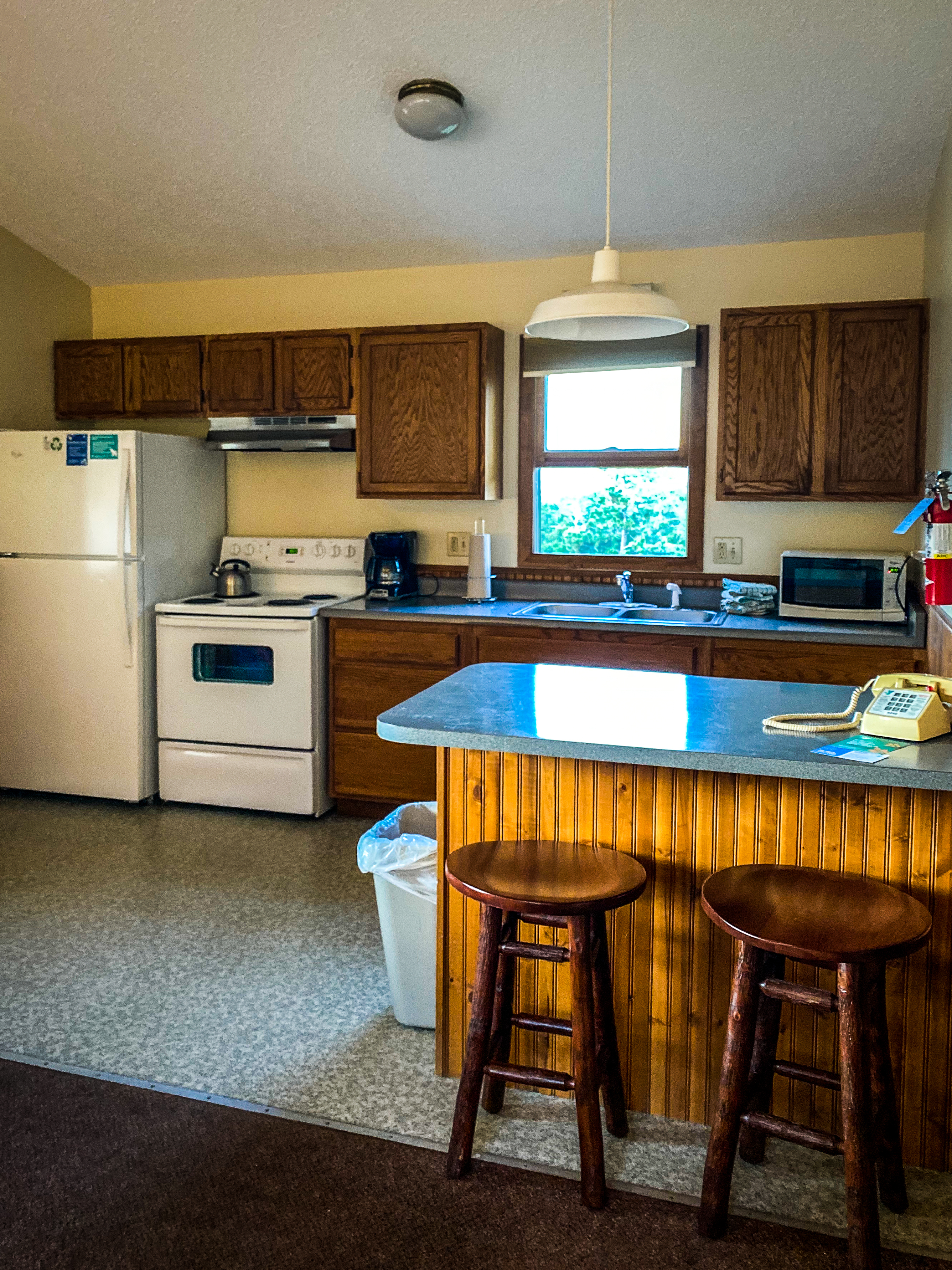 We were pleasantly surprised from the moment we entered the cabin how clean and spacious it was. Cabins have fully-equipped kitchens where guests can cook their own meals if desired. There are lots of pots and pans, baking dishes, coffeemaker, tea pot, plates, forks, etc. We brought all of our food and were able to cook our meals and enjoy them outside on the deck with mesmerizing views of the mountains.